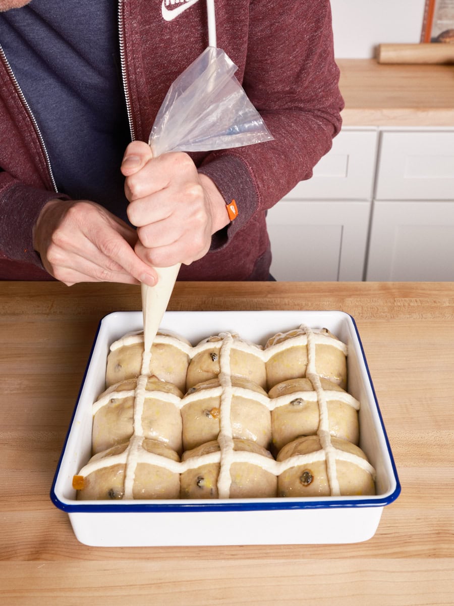 Before baking, apply the egg wash and pipe the crosses: Make the egg wash by whisking together the egg and 1 tablespoon milk. Uncover the pan and brush a light layer of the egg wash on the buns. Pipe a thin, vertical line of the cross mixture down the center of each column of buns. Rotate the pan a quarter turn and pipe another line down the center of each column, forming a cross on each bun.
