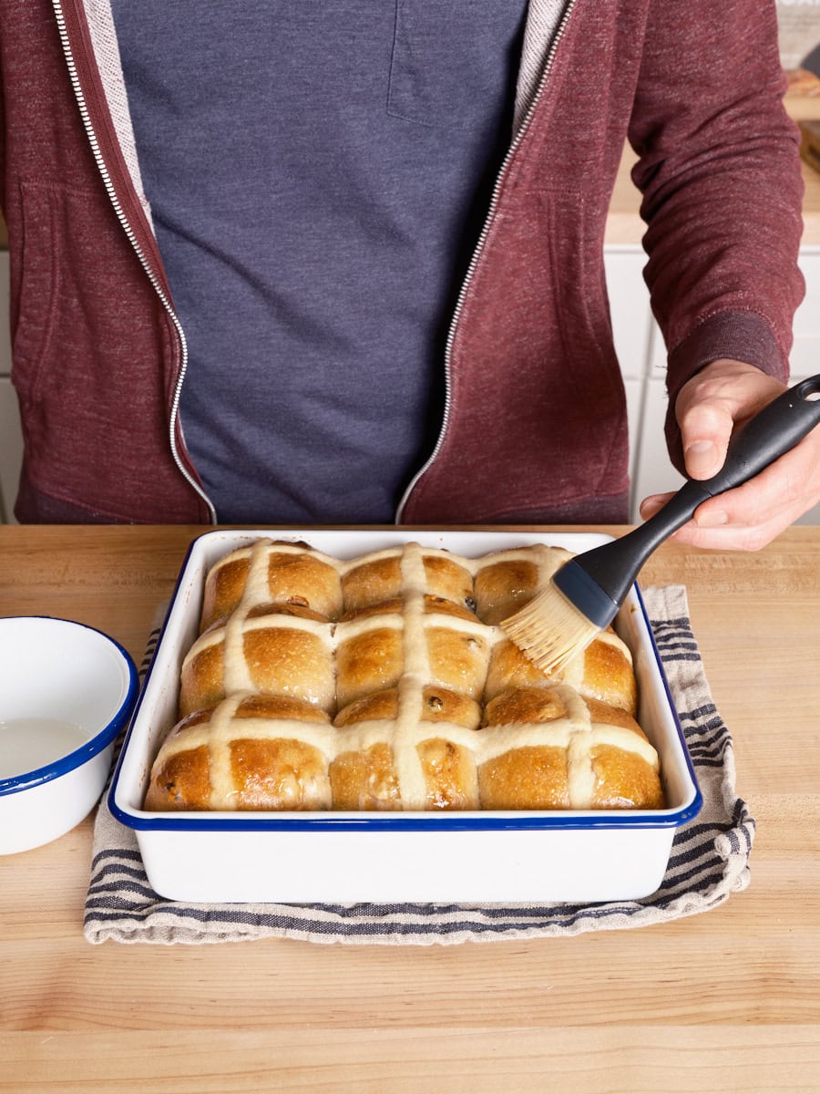 Finish and cool: Remove the pan from the oven, then brush a layer of the simple syrup onto the buns. Let cool for 5 minutes. Either serve warm straight from the pan or let them cool on a wire rack.