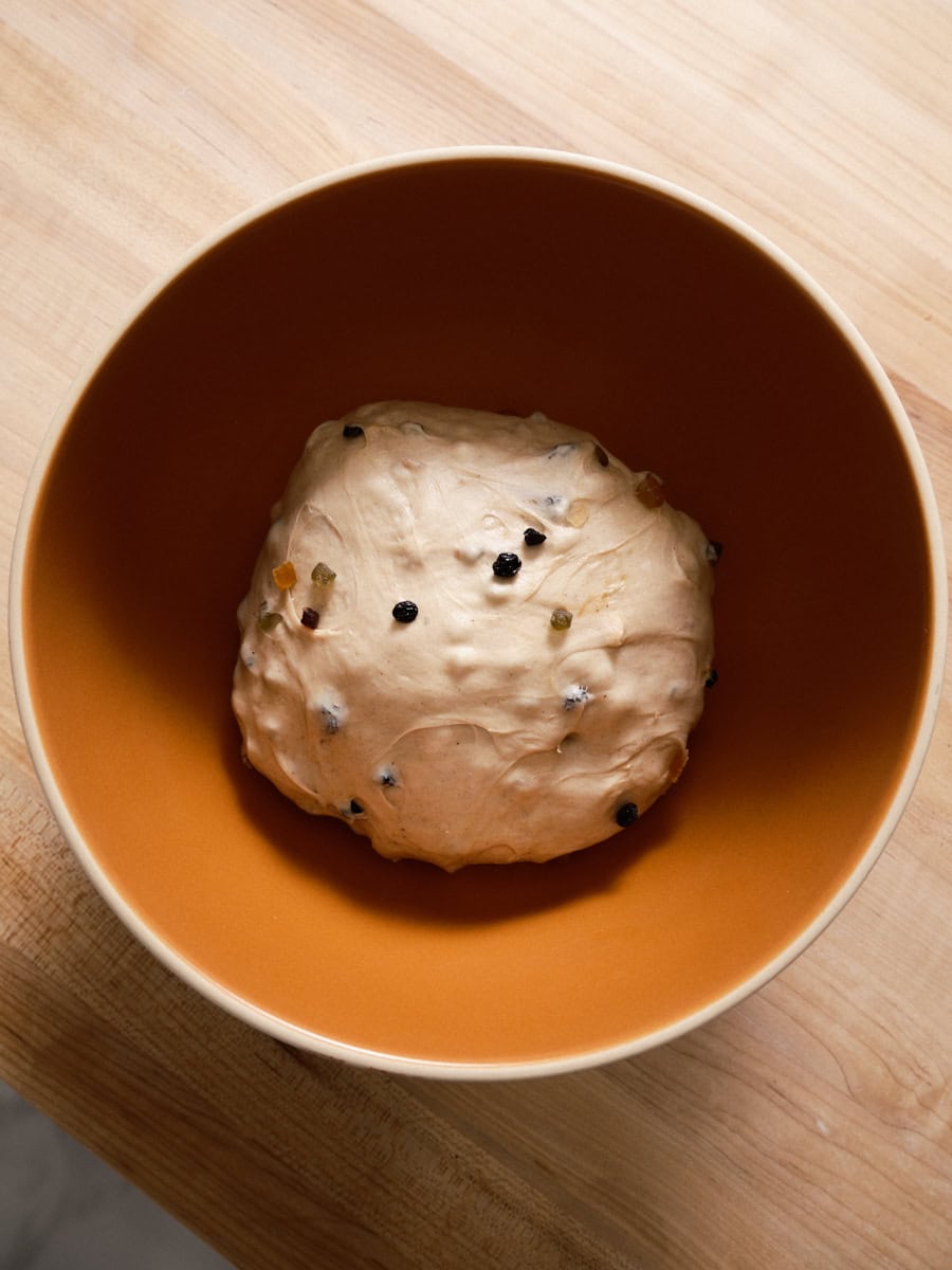 Put the 74g raisins (or candied peel as you see in this post) and 49g dried currants (these are my favorite) in a medium bowl. Pour in enough water to just cover the dried fruit (the excess will be drained before the fruit is added to the dough). Cover the bowl and let soak until bulk fermentation.