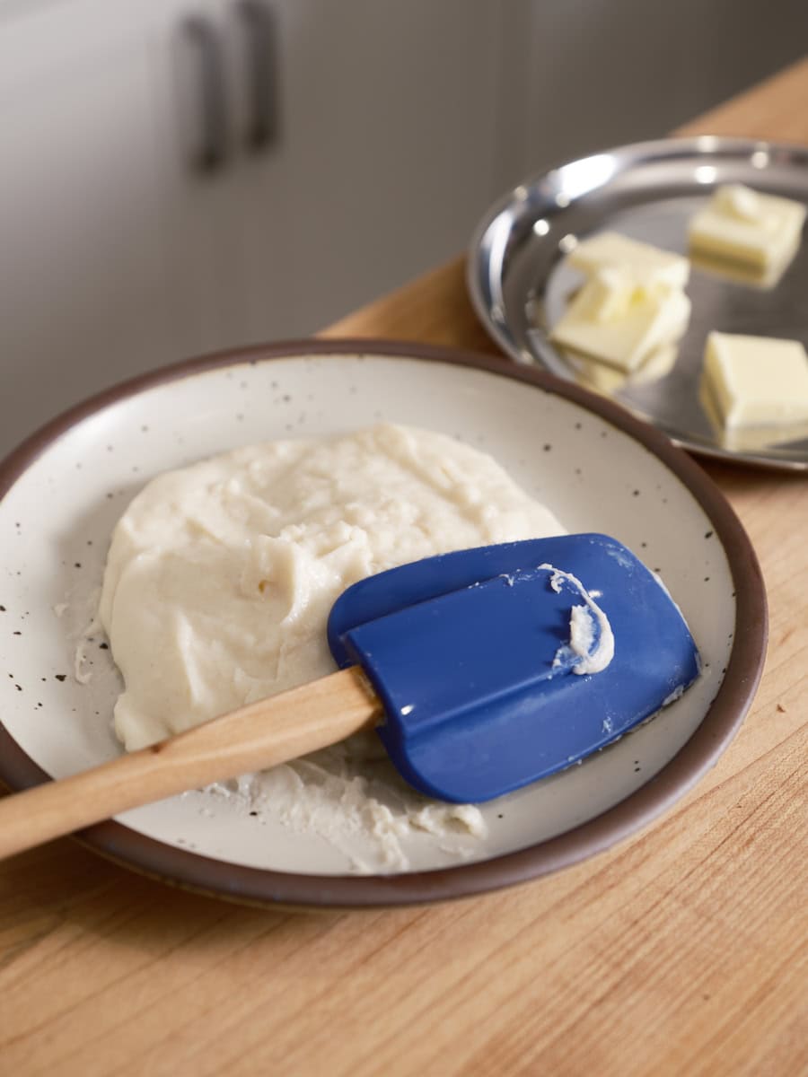 Prepare the butter: Cut the butter into 1/2-inch-thick pats. Place in a bowl on the counter to warm to room temperature until mixing.